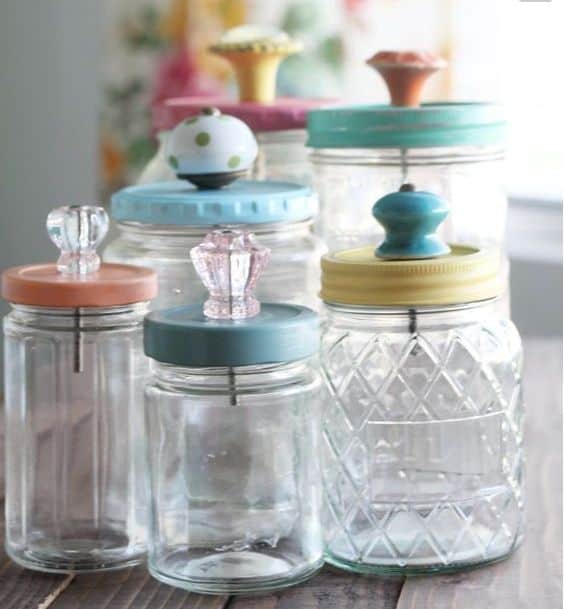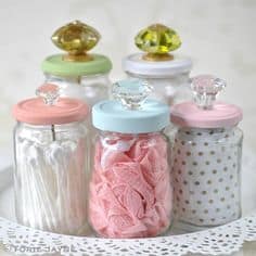 Avete presente i barattoli che solitamente contengono i contorni sott’olio? Possono diventare dei pratici contenitori per i cotton fioc o per i dischetti di ovatta. Possono essere decorati oppure potete aggiungervi dei simpatici pomelli sui coperchi rendendoli super chic.