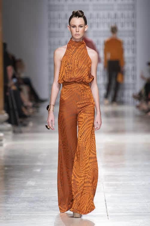 Ad accompagnare i colori elencati anche outfit curcuma con stampe. Anch’esse ottiche e geometriche nei colori arancio e tortora.