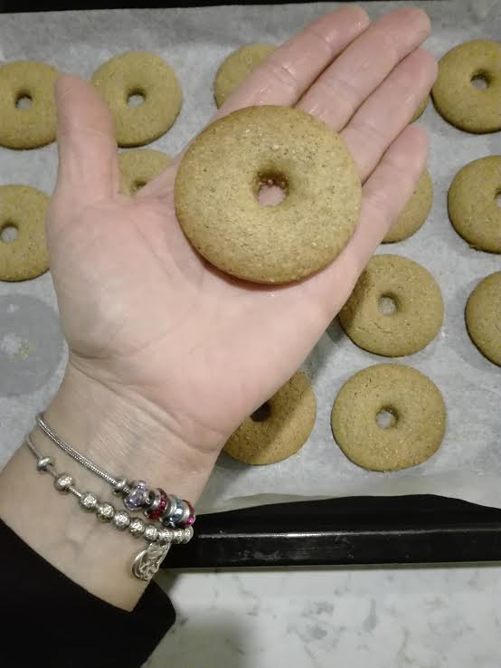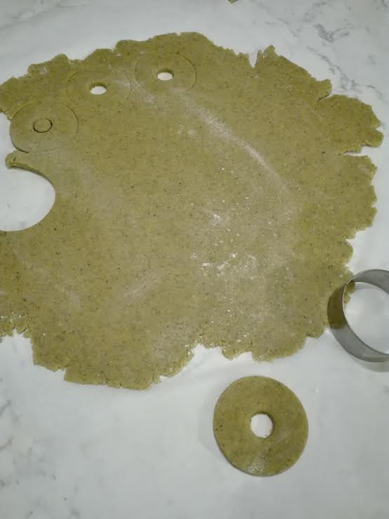 Stendere la pasta all’altezza di 1 cm e dare la foma che si preferisce, io ho utilizzato la classica con uno stampino a forma di biscotto con il buco.