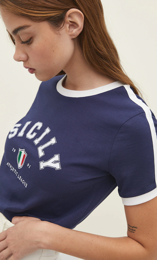 Se non hai una casacca vintage, potresti cercarla nei negozi second hand o in alternativa, acquistare una t shirt di ispirazione calcistica, riproposta da marchi come Stradivarius (vedi foto) oppure nei negozi a tema sportivo.