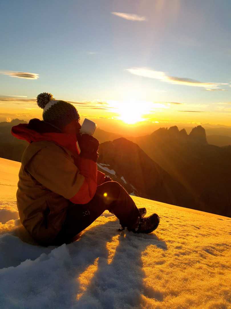 Quando mi alzo per prima cosa accendo la fornella che si è spenta durante la notte. Scaldo il caffè e vado fuori a guardarmi l’alba insieme a tutte le persone che dormono lassù. Non serve neanche la sveglia, perché dal momento che il sole inizia ad albeggiare, tutte le persone escono a guardarsi l’alba ed è inevitabile svegliarsi.