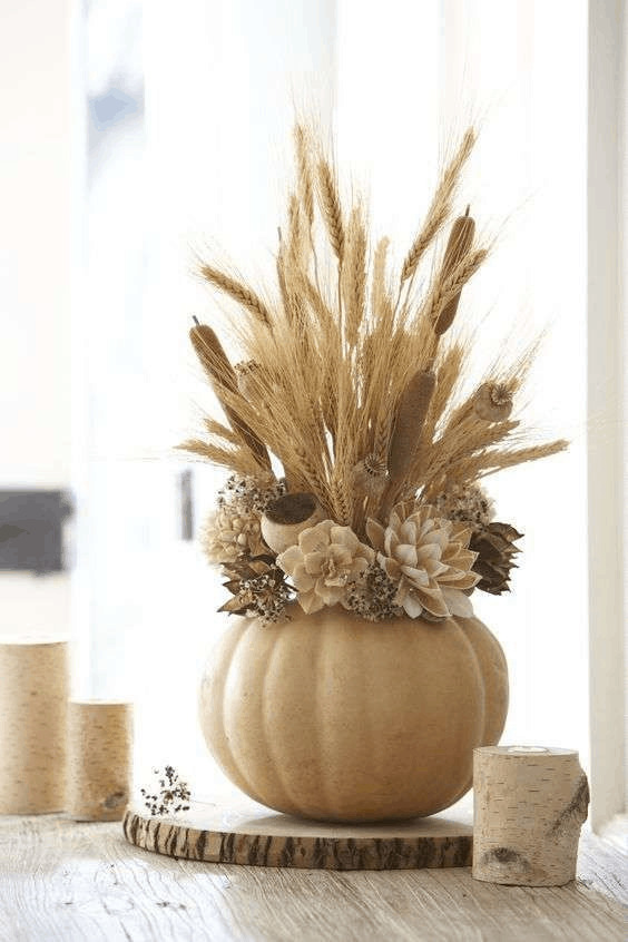 - super carine sono le zucche a cui viene tagliato via il picciolo, e svuotate, e all’interno vengono posti fiori, fiori secchi, spighe, candele… come se la zucca fosse il vaso. Spazio alla fantasia!