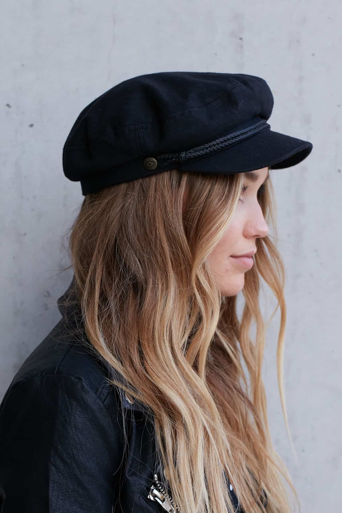 Il classico cappello del capitano della nave, lupo di mare, è uno dei copri capo più in della stagione. Molto d’effetto sui capelli lunghi. (https://www.princesspolly.com/brixton-black-fiddler-cap)