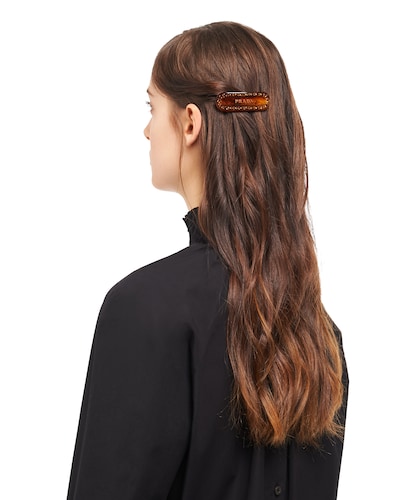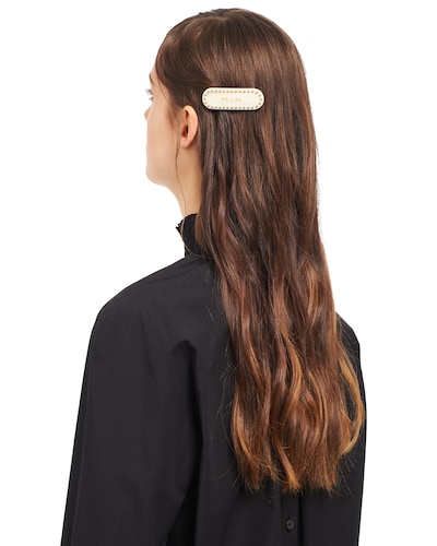 Fermaglio per capelli in Plex, decorato dal logo Prada e da borchie applicate.