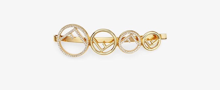 Fendi dispone di 4 varianti, tutte realizzate in metallo con finitura dorata.ย I primi due modelli sono con motivo F is Fendi, decorato con cristalli naturali o con perle bianche.