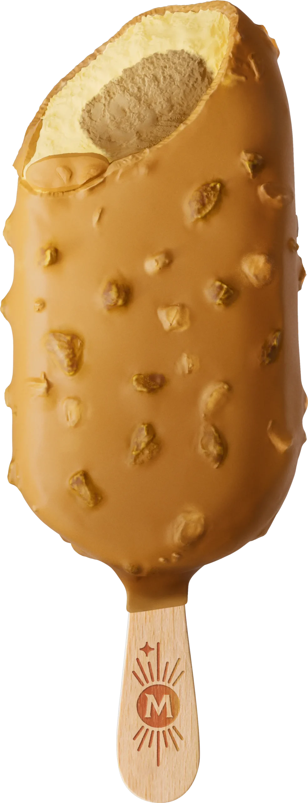 - Croccantino: biscotti al caramello che accompagnano il gelato al gusto vaniglia con inclusioni e variegatura al caramello salato e guarnitura al gusto caramello salato.