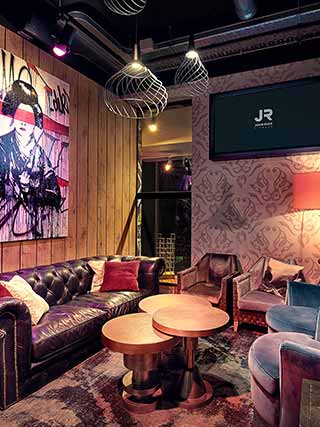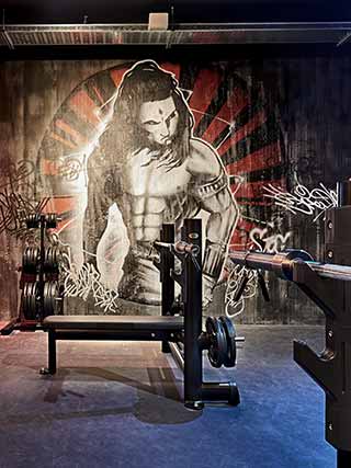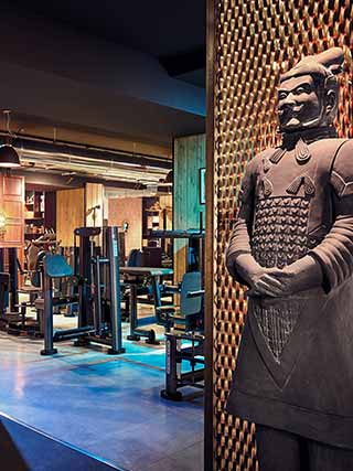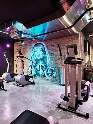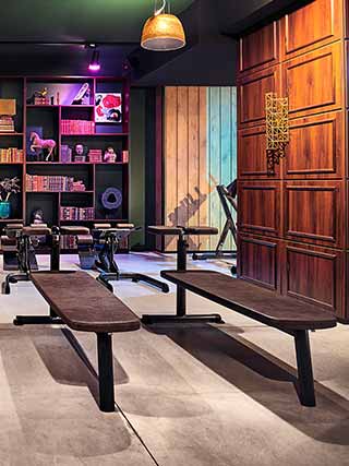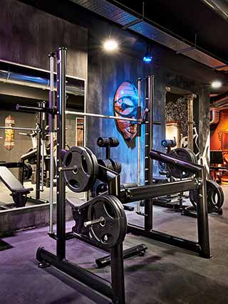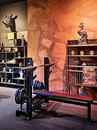 L’arredamento sembra quasi il set di un film di avventura, tipo Indiana Jones. Statue buddiste, samurai, librerie in legno scuro, lampadari da stanze del sigaro, insomma un’atmosfera a metà strada tra l’esotico, l’urban e il raffinato che, insieme alla consolle per il dj, trasformano la palestra in un locale glamour. Un mix di colori, forme e materiali che affascinano e ispirano, tra elementi di design di epoche storiche diverse.