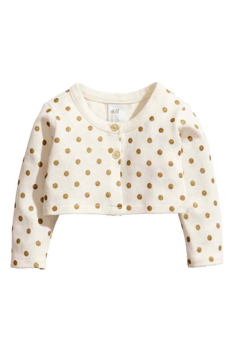 Terminiamo con H&M: per le baby-girl un abito oro a maniche corte, sul quale potete far indossare un allegro bolero panna a pois oro.
