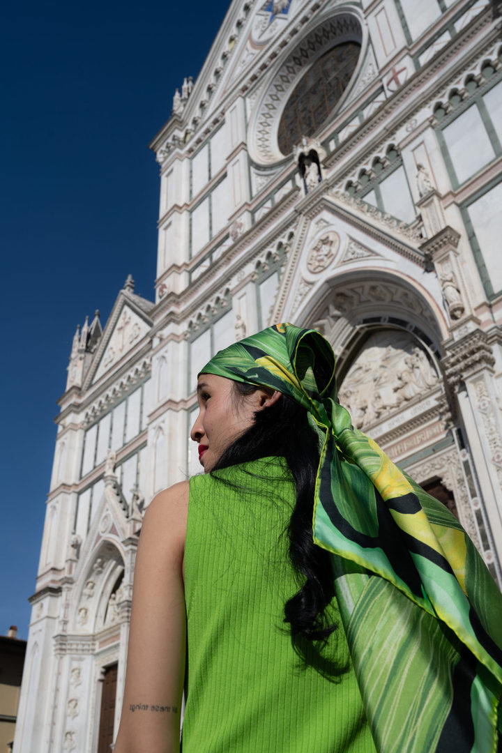 Il punto di partenza, appunto, sono i foulard che in questo infinito gioco che salta dalla tradizione all’innovazione, lei battezza foulara. Nelle sete di Lara io ritrovo quella versatilità che tanto amo in questo tipo di accessori: che sia un carré classico, una bandana o una tagliatella, il foulard ti distingue, dà al tuo stile un marchio unico e inconfondibile.