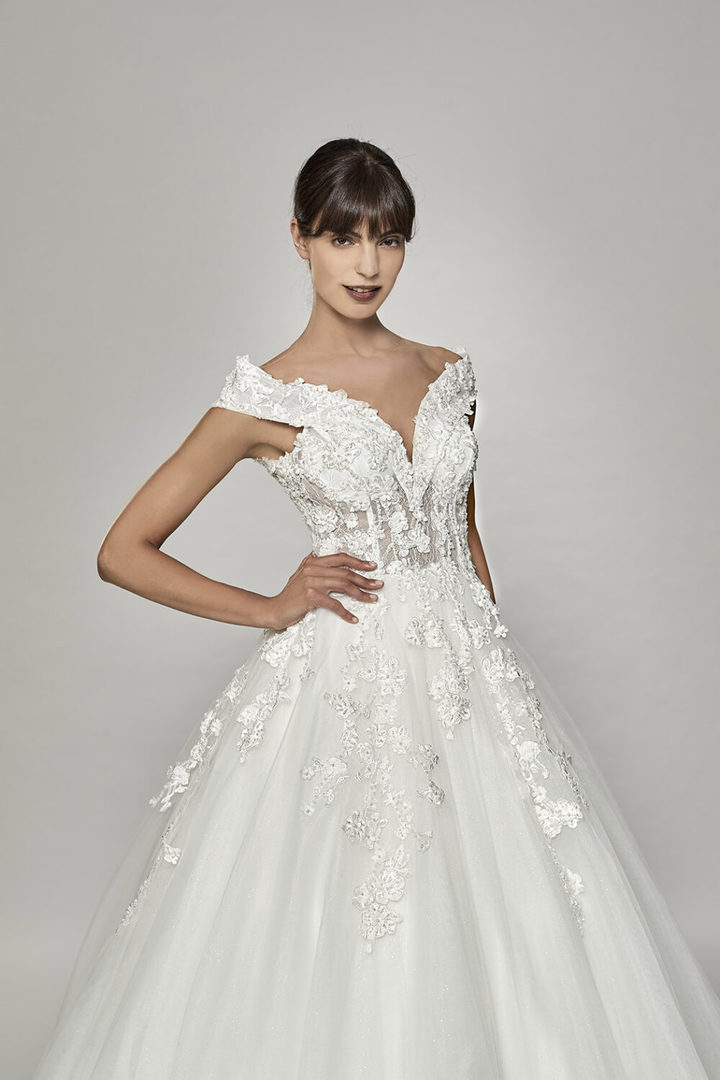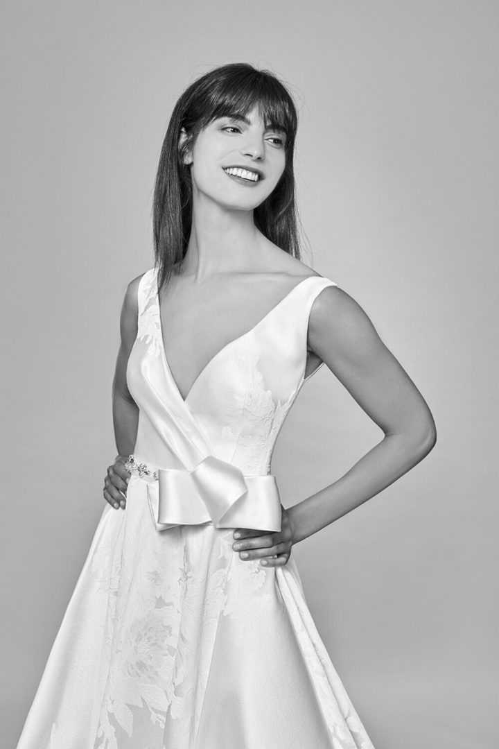 La collezione timeless 2021 si anima con sperimentazioni eclettiche: l’alta moda degli anni 50 è celebrata dal faille che diventa ecosostenibile. A questo si uniscono la sofisticata charmeuse e i piquet jaquard. Le organze ricamate con macro fiori e il tulle plissè si ispirano alla couture anni 70 e vanno ad impreziosire abiti dai volumi ampi. Le spose di Bellantuono