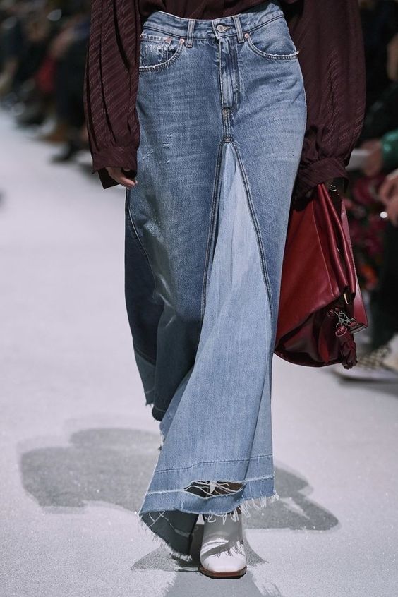 I jeans a vita bassa, che andavano di gran moda alla fine degli anni ’90 e all’inizio degli anni 2000, sono ritornati e con loro anche la gonna lunga in denim.