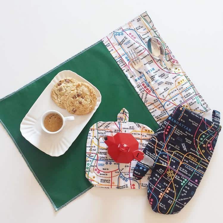 Le prime in assoluto sono proprio un omaggio a New York, dove ho trovato questa stoffa meravigliosa con la cartina della metro della Grande Mela e me ne sono subito innamorata. Così sono nate le prime creazioni per la cucina. Ho realizzato le tovagliette colazione e anche presine e guanto da forno.