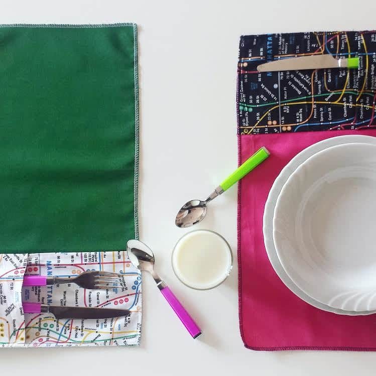 Le tovagliette sono state pensate in tinta unita con l’applicazione della stoffa tematica su un lato. Nell’applicazione ho creato una tasca ideale per riporre tovagliolo e posate.