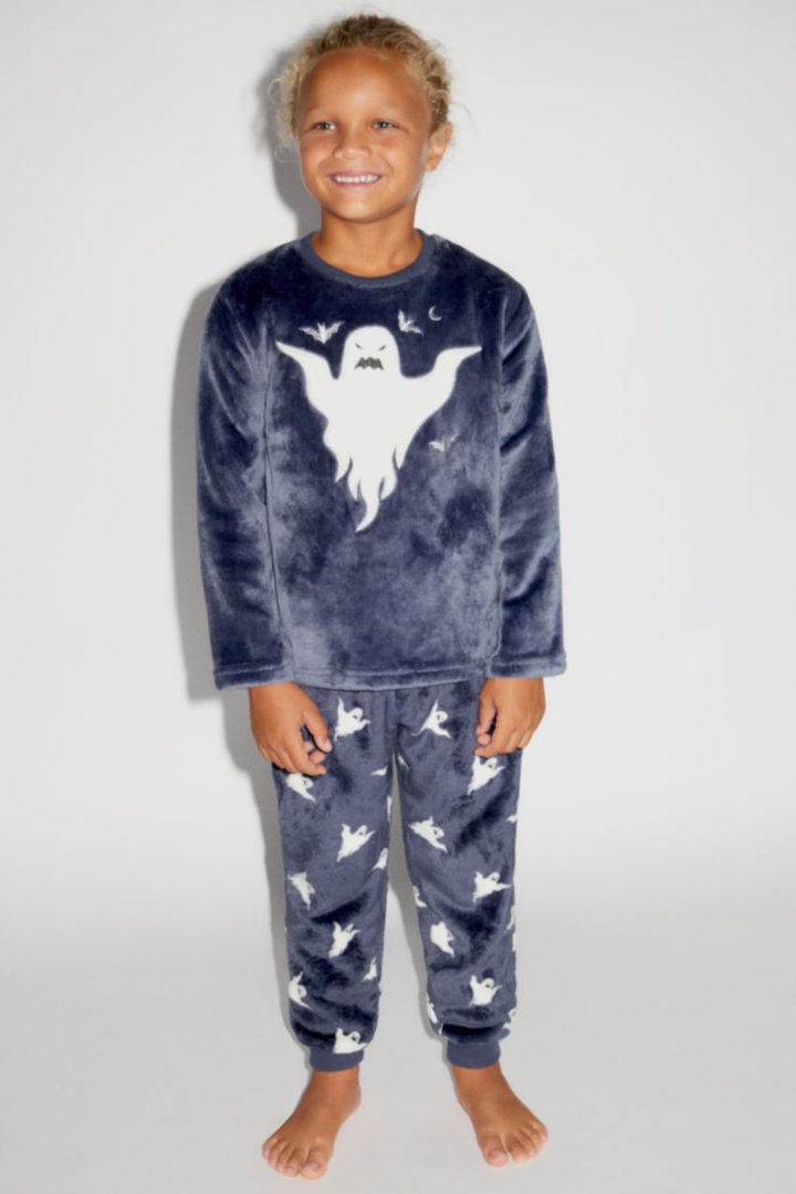 E per la notte spaventosa ecco i pigiami composto dalla maglietta con collo rotondo e maniche lunghe.