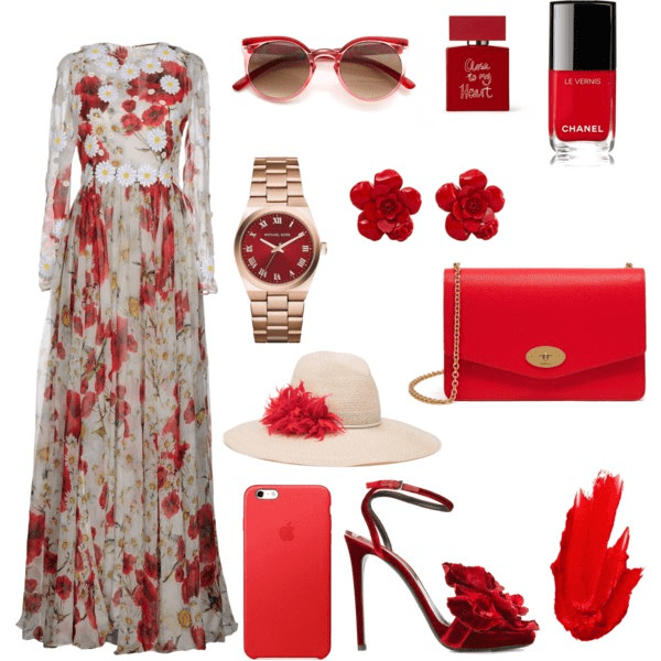 Ho scelto questo abito con fantasia sui toni del rosso per uno stile deciso. Rosso anche per la parte dedicata agli accessori: sandali con un tacco importante (e alto), orecchini che richiamano il tema floreale, orologio con quadrante rosso, occhiali e clutch (sempre rigorosamente rossi).