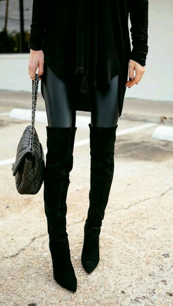 I leggings di pelle sono un must have indispensabile, perfetti con camicia e maglia over e uno stivale cuissard, altro fin sopra il ginocchio, ma anche con una decolletè. Adatte per svariate occasioni, dalla passeggiata della domenica all’aperitivo con le amiche.