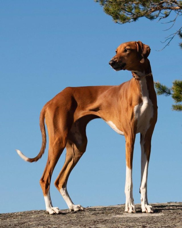 Alto e snello, l’Ibizan Hound è un levriero spagnolo usato per la caccia ai conigli. La sua testa allungata e le orecchie dritte ricordano le figure dell’antico Egitto.