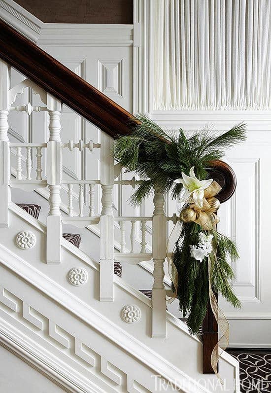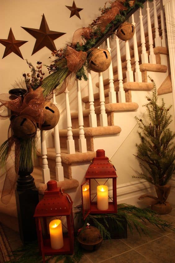 Se hai una scala con ringhiera, puoi sbizzarrirti con tantissime idee per decorarla. Ghirlanda appesa fatta di fiori, foglie di pino, sfere di metallo e ornamenti sulla ringhiera. Acquista gli “Swags Door” e posizionali ad intervalli uguali sulla scala. Posiziona le piante in vaso lungo i gradini o all’angolo ย per dare un tocco verdastro e aggiungi alcune luci a led su questi alberi per un effetto sbalorditivo al buio. Appendi ghirlande, lega insieme steli e frutti in rilievo con nastri e posizionali sulle pareti laterali.