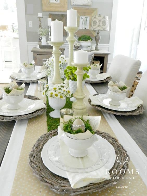 Tavola di Pasqua addobbi: date nuova vita anche alla vecchia argenteria o a pezzi del servizio di ceramica della nonna ormai spaiati; il bianco latte spiccherà ancor di più con sopra adagiate le piccole uova colorate e i rametti di legno ed erba fresca.