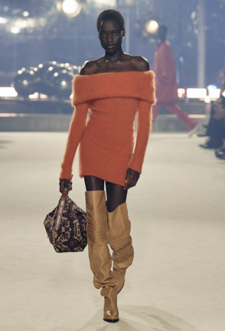 Maglioni e cardigan sono abbinati a pantaloni dai richiami anni settanta, a mini abiti da abbinare a stivali alti sopra il ginocchio e a gonne di varie lunghezze.
