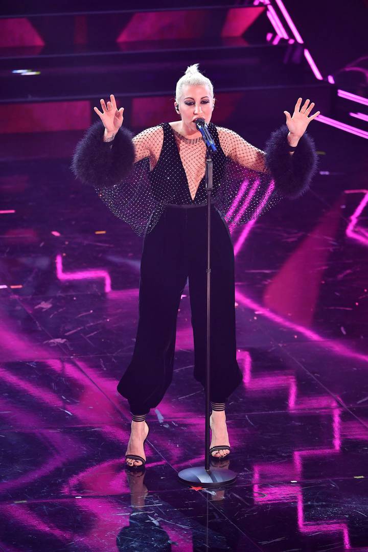 Il look di Malika Ayane è firmato Giorgio Armani.