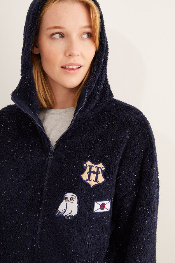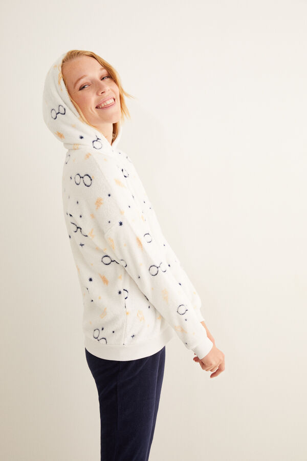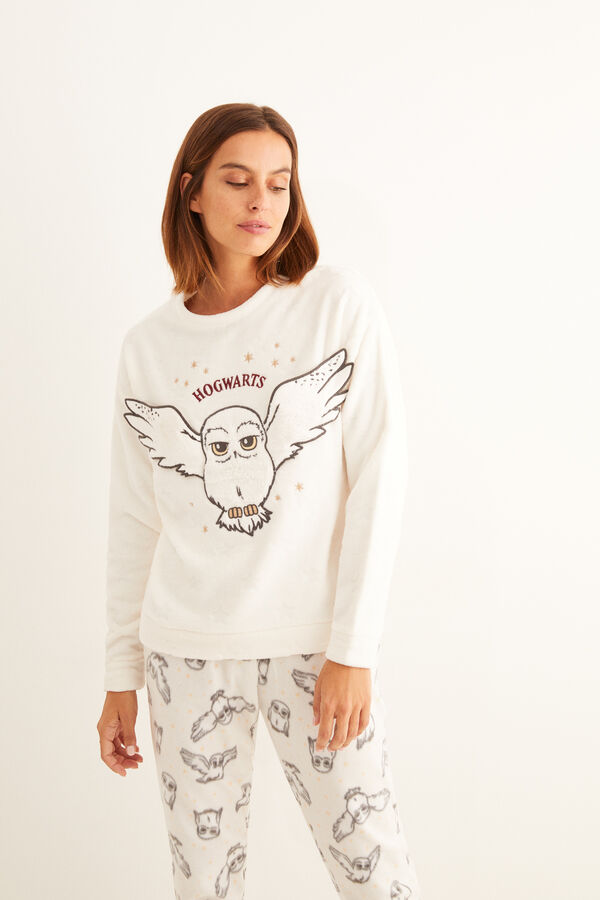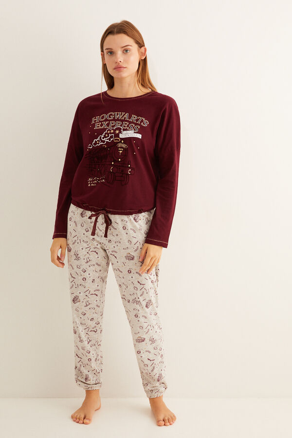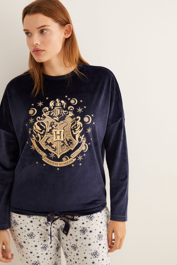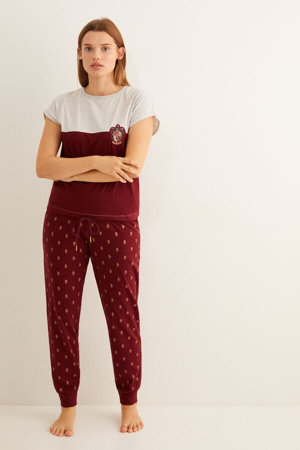 Maglietta gialla a maniche lunghe con gli stemmi della scuola di magia. Pantaloni grigi abbinati, con orli con risvolto e vita elasticizzata. Anche il tempo che trascorrerete in casa sarà un po’ più magico grazie a questi pigiami speciali. I loghi della saga più amata al mondo vi faranno compagnia su ogni accessorio.